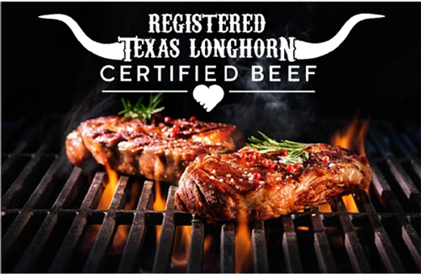 All beef is from fully registered longhorn cattle that have been raised at our ranch in Central Texas. They are humanely treated & processed at either a USDA or Texas Health & Human Services facility and come in labeled & weighed vacuum sealed packages. When available, cuts include Ground Beef, Roasts (Chuck, Rump, Round), Steaks (Rib Eyes, T-Bones, NY Strips, Sirloin, Tenderloin), and Fajitas.